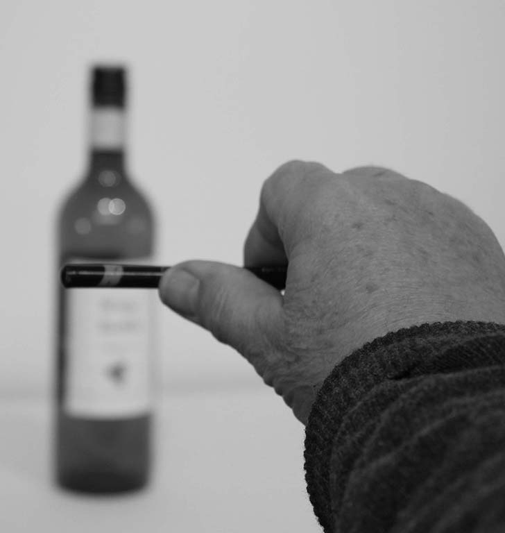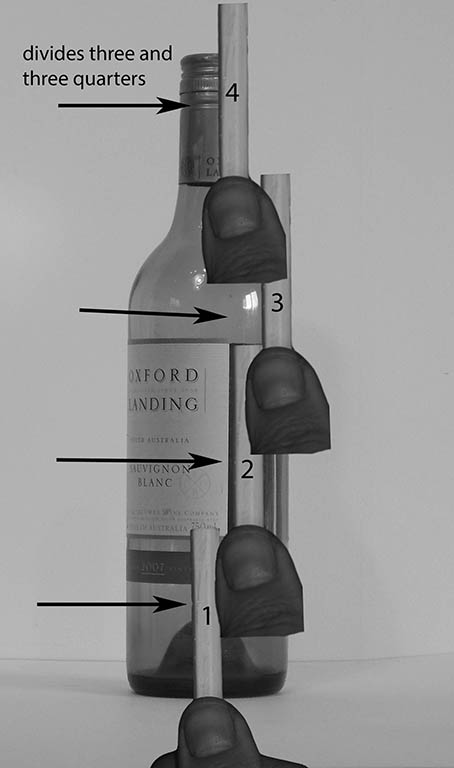 Keep your hand in the same position, divide the width into its height. Yes, it divides up 3 & 3/4. With this knowledge, you can then drawing your bottle to any size, knowing that its width on your paper or canvas must divide up 3 & 3/4. To see it in practice, watch the video.